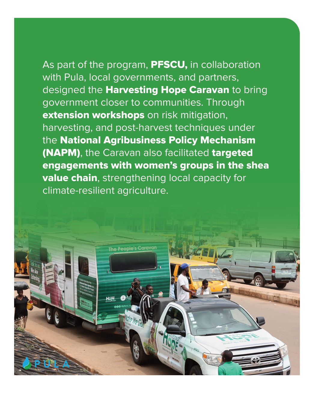 To bring government closer to communities, the partnership also launched the Harvesting Hope Caravan — a mobile extension platform delivering workshops on risk mitigation, harvesting, and post-harvest practices, while engaging women’s groups in the shea value chain to strengthen local resilience.